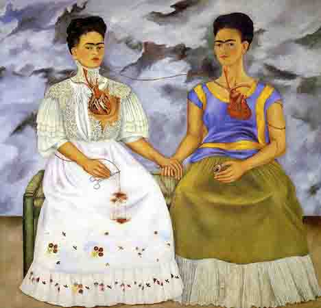 Painted when Frida Kahlo was divorced from Diego Rivera she is depicted as two conflicting yet connected portraits of her persona. She grasps her hands and where, on the right she clasps a locket of Rivera and shows her exposed heart intact, on the left her heart is dissected and she holds macabre surgical scissors. The left image is the Kahlo that is rejected.